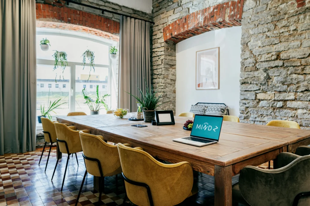 Stiilne koosolekuruum rustikaalses võtmes – avar ruum suure laua ja puhkealaga.